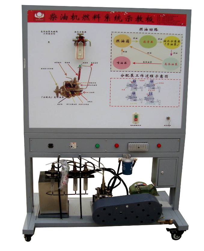 本产品选用原车柴油发动机燃油喷射系统实物,展示汽车柴油发动机燃油喷射系统的结构与原理;面板上绘有完整的汽车柴油发动机燃油喷射系统的原理图,设置有检测端子,可通过仪器仪表检测各种信号参数如电压、电阻、频率等。本示教板功能齐全、操作方便、安全可靠。