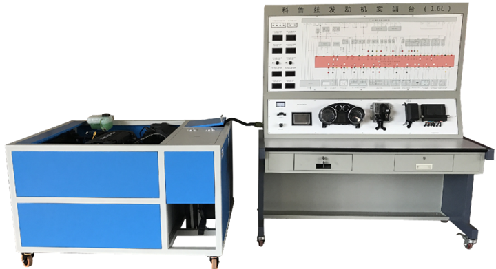 发动机总成和发动机控制单元、仪表总成、冷却液温度传感器、进气温度传感器、节气门控制总成、空气流量计、发动机转速传感器、凸轮轴位置传感器、氧传感器、点火开关、整套散热机构、汽油箱和汽油泵总成、蓄电池、等数字电压表、喷油脉宽表、真空压力表及燃油压力表、带有完整彩色三维数码激光打印电路原理图面板、外接式检测端子、故障设置盒总成、可移动台架、使用说明书及实验指导书。