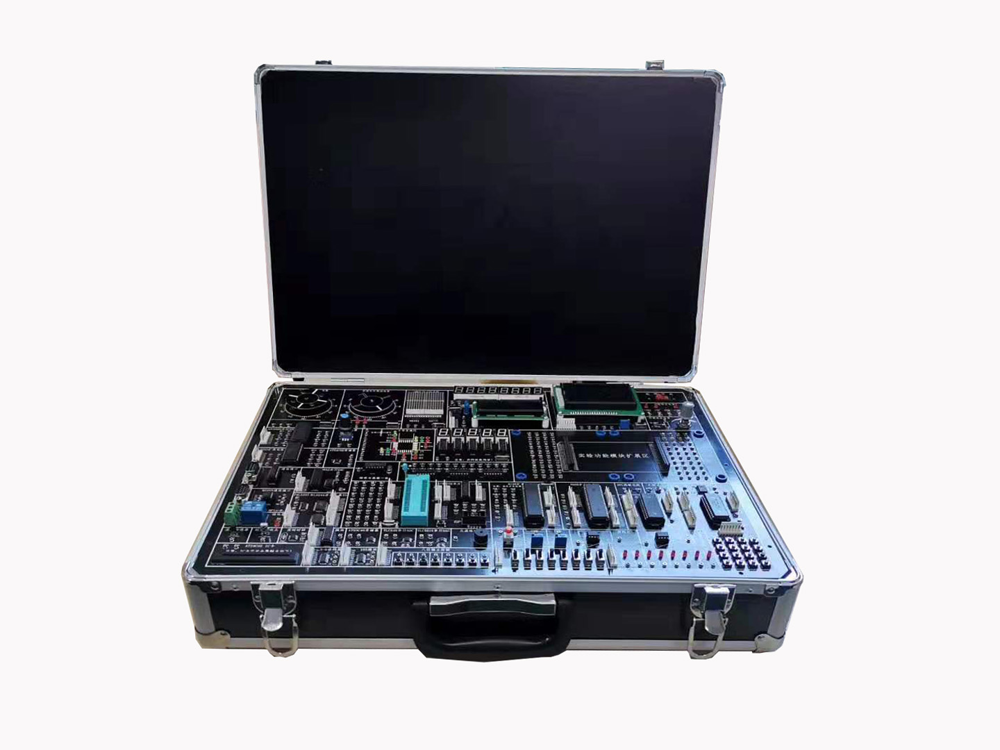 实验箱为铝合金框架结构,实验箱由主板(黑色线路板、多种电源系统,电源带全自动保护)、各种模块(共计45种,能自由插拔供取下学生练习,各种模块的供电电源均为:+5V/1A,±12V/0.5A,0-5V可调电压信号)和ISP下载器组成。